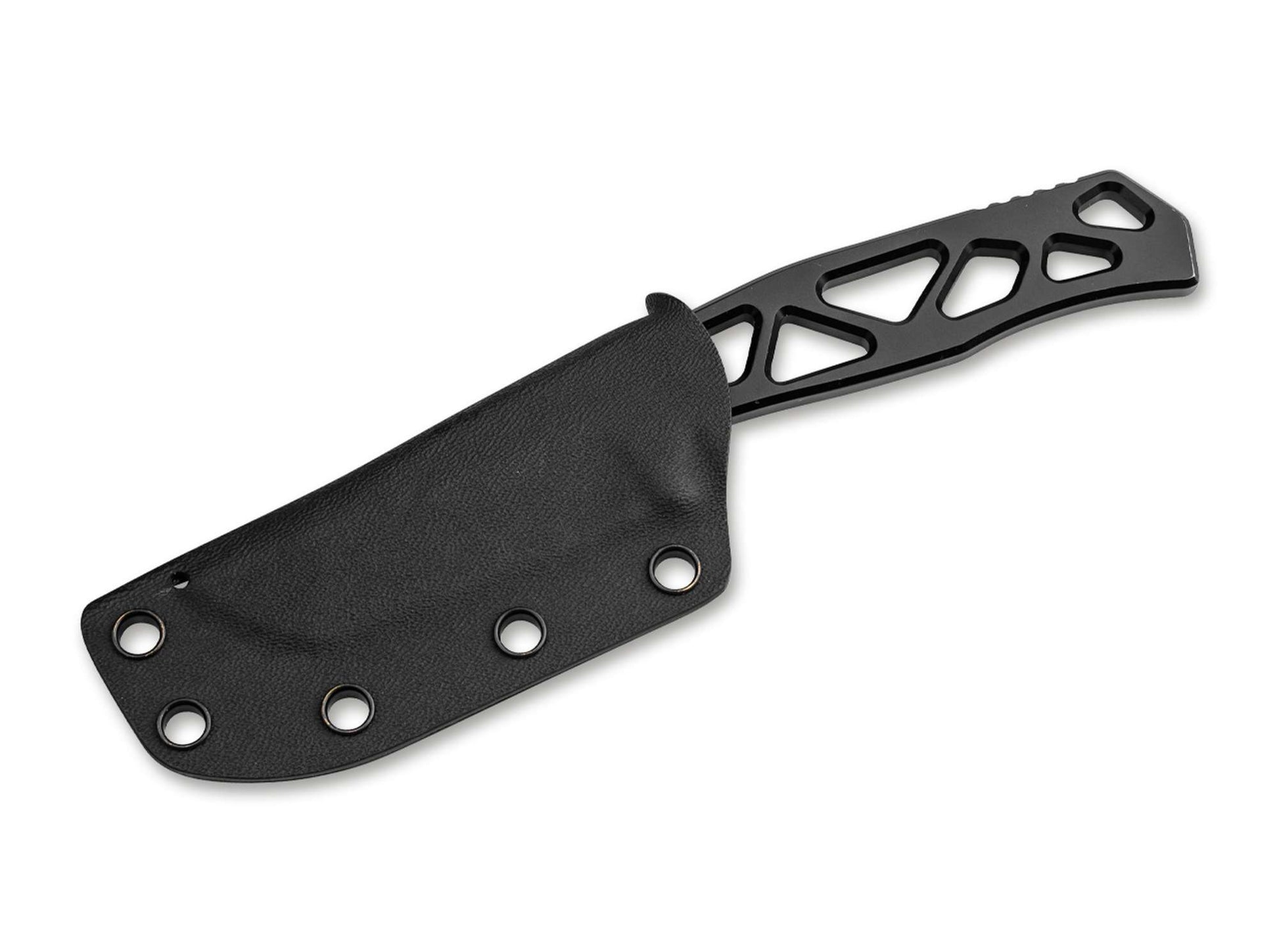 Das Heckler & Koch FX01 ist als kompromissloses Ganzstahlmesser mittlerer Größe in skelettierter Bauweise ausgelegt. Die Konstruktion erlaubt volle Funktionalität bei konkurrenzloser Robustheit und gleichzeitiger Flachheit. Auf diese Weise ist das Messer sowohl offen, beispielsweise am Molle-Gurtzeug, oder verdeckt zu tragen und stört die Bewegungsabläufe weder im zivilen noch im behördlichen Alltag. Die Tanto-Klinge aus schnitthaltigem D2-Stahl ermöglicht vielfältige Einsatzmöglichkeiten wie Schneiden und Schaben. Ein schwarze Titanbeschichtung schützt vor Reflexion. Die flache Feuchtigkeitsunempfindliche Kydex-Scheide kann mit dem im Lieferumfang enthaltenen Federstahl-Clip am Gurtzeug in der Bekleidungstasche oder im Innenbund getragen werden. Die Ösen ermöglichen zu dem die Montage anderer gängiger Befestigungsadapter (Tek-Lok, IWB-Belt-Loop etc.).