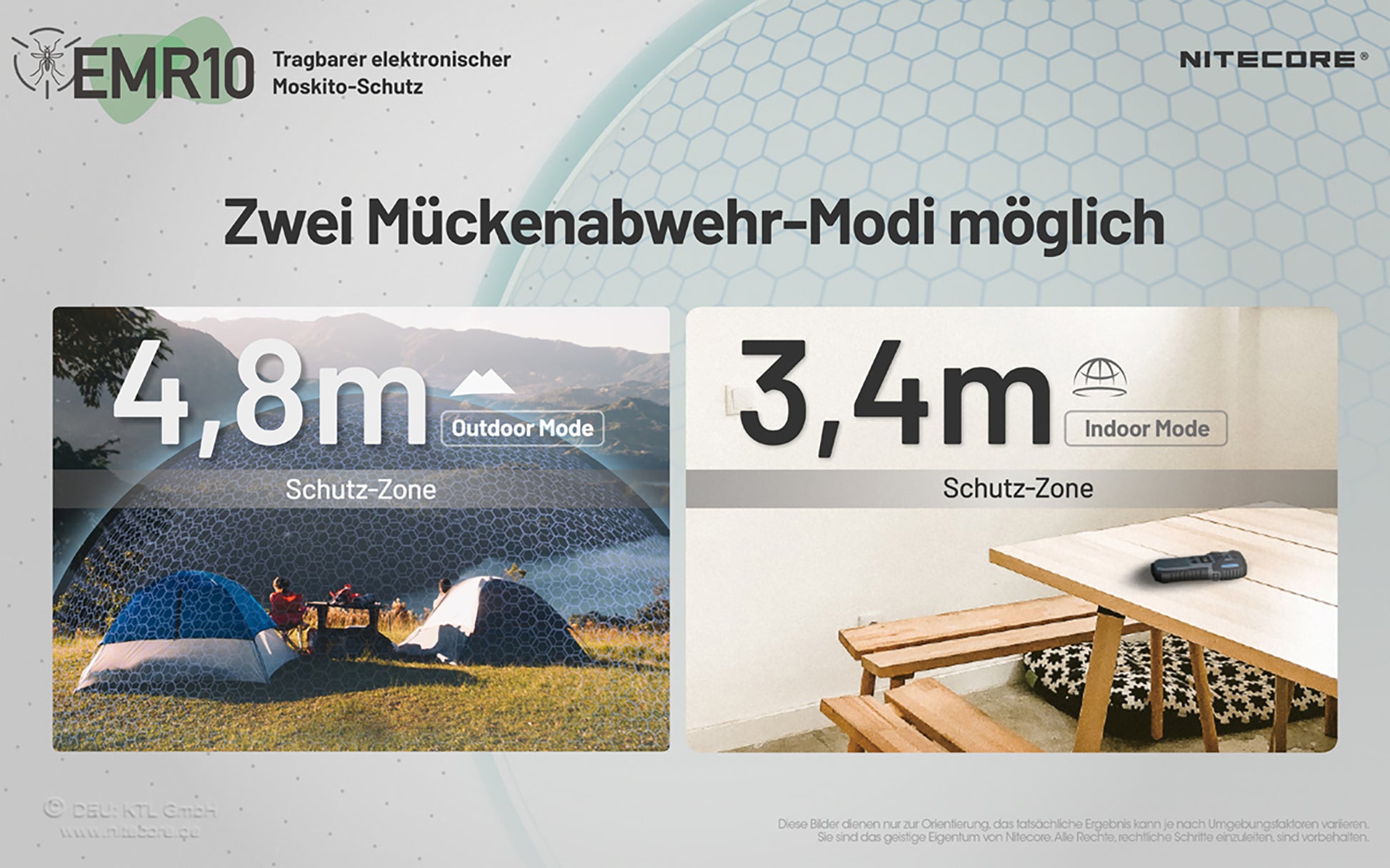 Der verdampfte Wirkstoff ist geruchsneutral und erzeugt eine "Duftglocke" von ca. 5 Meter Durchmesser. Ein Wirkstoffplätchen Nitecore MRM10 reicht für ca. 6 Stunden, die MRM10 sind beidseitig verwendbar! Der EMR10 bietet auch die Möglichkeit über Ultaschall Kleingetier wie Mäuse fernzuhalten. Für den optimalen Einsatz stehen zwei unterschiedliche Modi zur Verfügung - der Outdoor und der Indoor Modus. Die beiden Modi unterscheiden sich in der Größe der "Duftglocke".