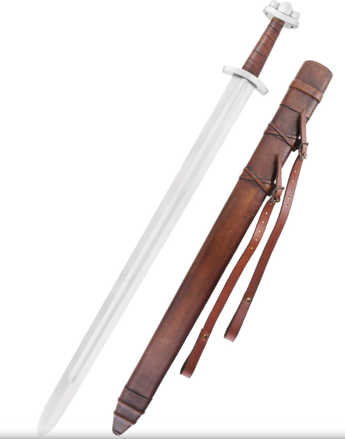 Das Schwert stammt aus dem 8. Jahrhundert und besitzt die typische Formgebung eines frühmittelalterlichen Wikingerschwertes: eine kurze und leicht nach vorn gebogene Parierstange, eine zweischneidige und gerade Klinge mit Hohlkehle, ein breiter Knauf mit drei Wülsten. Dieses Schwert ist ausschließlich in Handarbeit gefertigt. Die Parierstange und der Knauf mit den drei Wülsten sind aus wärmebehandeltem, schmiedbarem Gusseisen. Die Klinge aus Federstahl ist bis zum Knauf durchgehend und dort handvernietet. Der Griff ist mit breitem Lederband umwickelt. Die Klinge verfügt über eine ausgeprägte Hohlkehle, welche dem Schwert große Elastizität und zugleich Leichtigkeit verleiht. Sie ist auf ca. 48-50 HRC in Öl gehärtet. Die Klingenschneiden sind nicht geschärft. Das Schwert kommt mit einer sehr schönen Holz-Lederscheide mit zwei an Riemen befestigten Schnallen. Man kann dort z.B. Riemen einer eigenen Schwertbefestigung einschnallen.