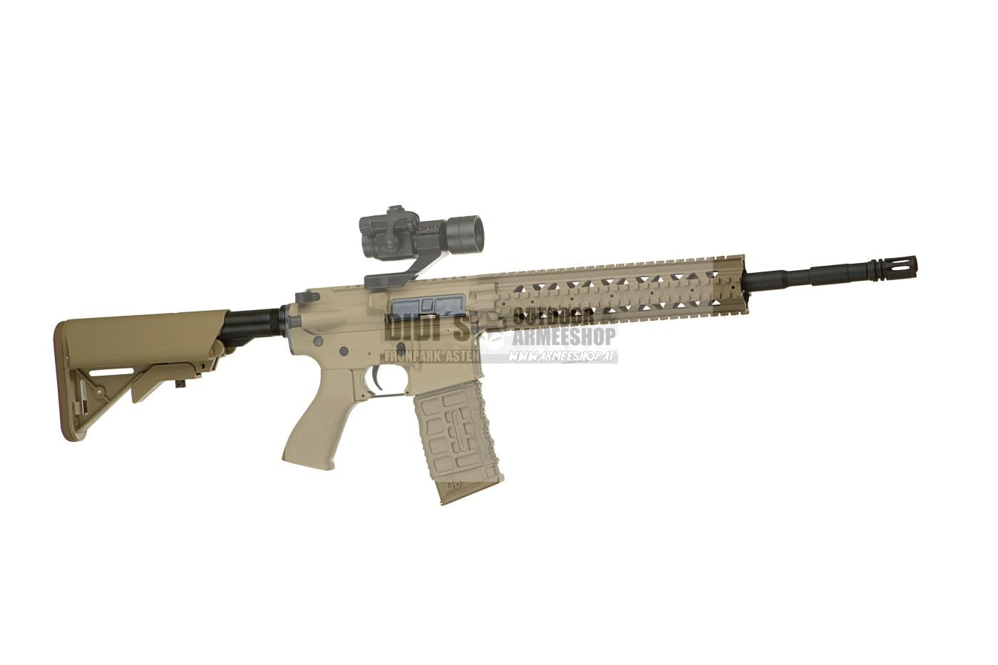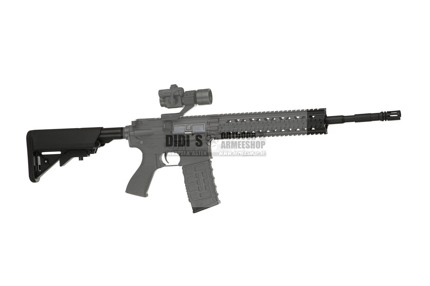 Der Lauf ist mit einem 14-mm-CCW-Gewinde ausgestattet und kann verschiedene Mündungsvorrichtungen, Schalldämpfer und Tracer aufnehmen. Der einziehbare Schaft aus hochwertigem Polymer ist komfortabel in der Handhabung. Er ist außerdem speziell für die Aufnahme von Akkus ausgelegt und lässt sich auf engem Raum leicht handhaben und verstauen.